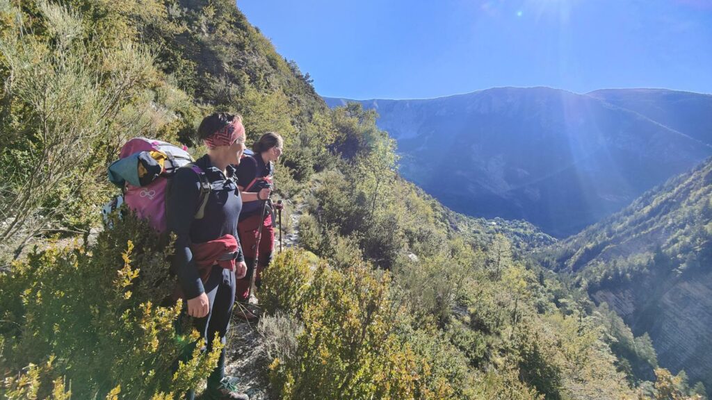 Arrivés le vendredi soir tard, nous bivouaquons au col du Fam. Le matin, il fait frais. Le givre recouvre l’herbe sèche. Nous attendons le soleil pour petit-déjeuner sous les rayons. A 9h00, nous mettons les sacs sur le dos pour une bonne marche d’approche, entre 2h30 et 3h00. Le sac de Robert est particulièrement volumineux. J’espère que le poids n’est pas proportionnel…