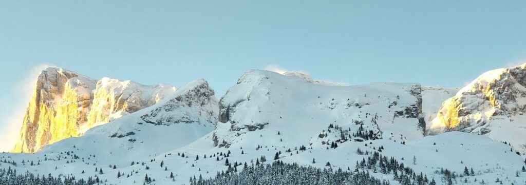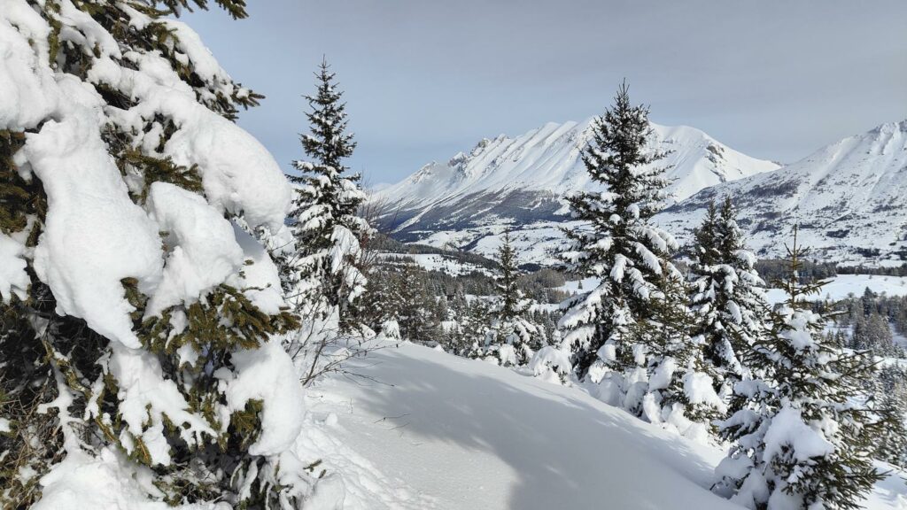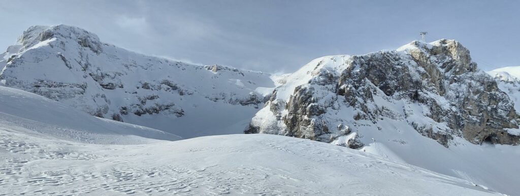 Ce matin, dès potron-minet, je décolle pour le vallon de Corne sous les câbles du téléphériques de Bure. Il fait encore bien noir, pourtant, les crêtes Est sont déjà en fusion sous les premiers rayons du soleil. Avec la neige, il y a un côté magique. Ski au pieds, il est 7h30 lorsque je démarre. Je ne mets pas longtemps à voir que je suis le premier. Les traces de la veille sont entièrement recouvertes par une neige fine. Le vent en soulève de gros paquets qui viennent me fouetter la figure.