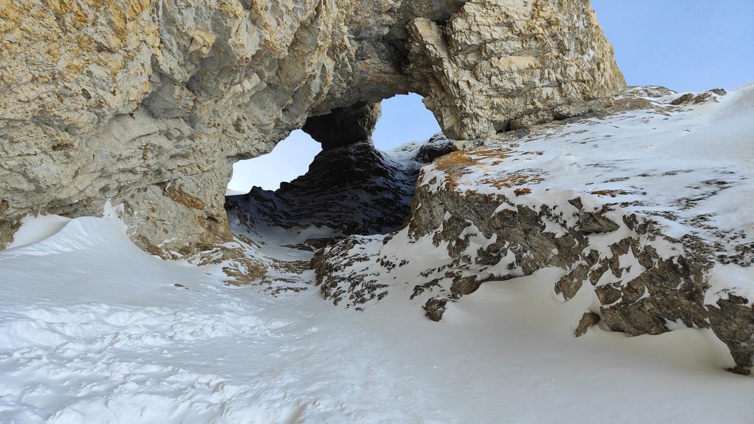 En termes de prospection, la journée sera décevante. Les quantités de neige ont tellement façonné la surface que les traces d’activités karstiques sont très rares. Le courant d’air a ouvert une cheminée de deux mètres de profondeur à l’entrée du chourum de l’Ours. Pour le reste, plus aucune trace des dolines et formes de surface.