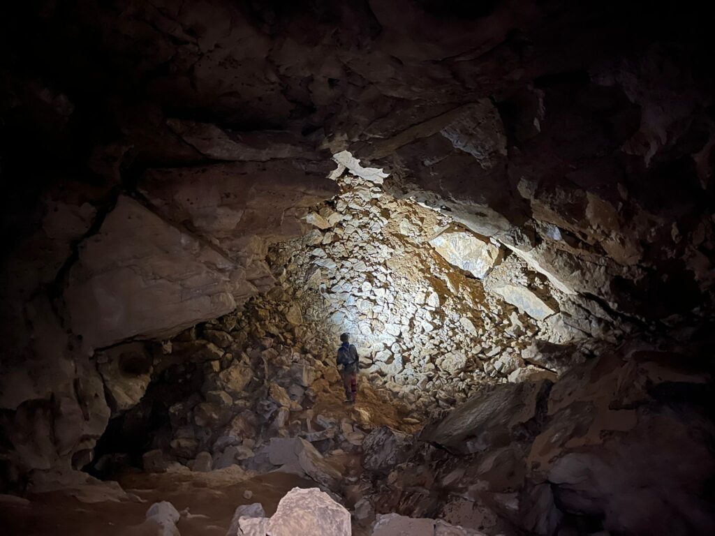 - Désobstruction d’une interstrate ouvrant sur une galerie d’une quarantaine de mètres, stoppée provisoirement par un bouchon argileux.